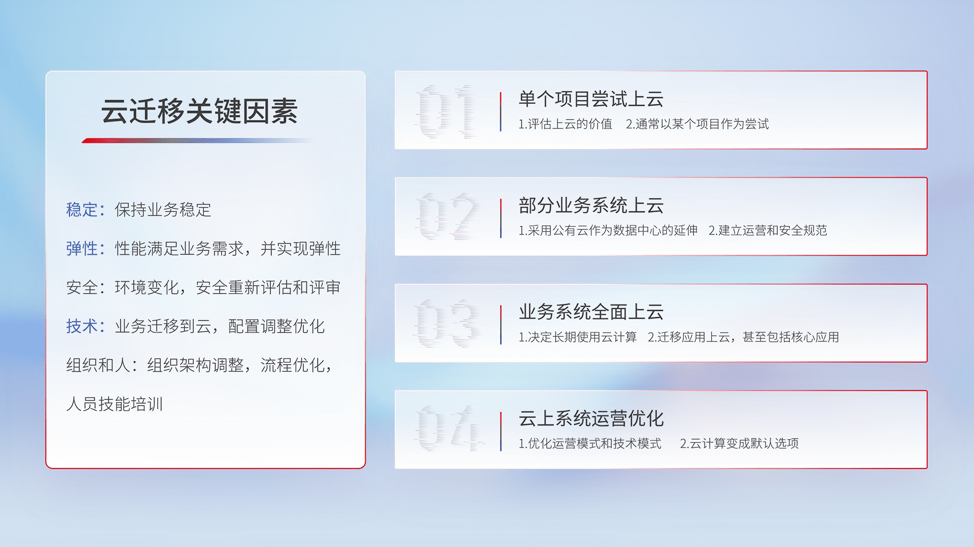 结合实际业务,,,,从规划设计、、、、云平台选型、、、、云原生改造、、数据迁移、、、、集成交付,,,迁移全过程为客户识别最佳上云路径,,,,做好风险识别管理,,,设计网络架构、、身份权限、、、、安全审计合规、、、、操作审计、、日志审计、、监控告警策略、、、多站点容灾设计等,,,,对云上基础设施进行整体规划,,,提升IT治理水平,,,,以满足弹性、、、、高可用、、高性能的需求。。。。