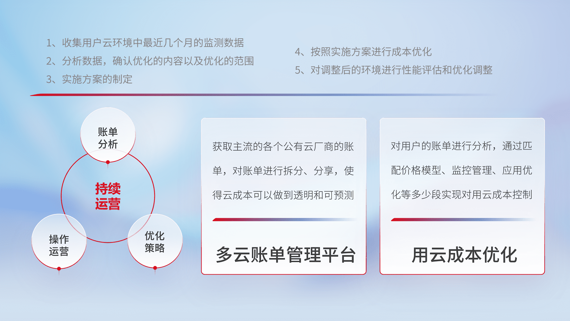 通过多云纳管,,,,以统一的资源数据模型把客户的云资源进行抽象和封装,,,,进而实现对多云资源的统一操作,,,,保障云资源管理的可靠性、、、稳定性与可用性。。。。量身定制化运维内容,,,配置、、、开发运维、、、、补丁管理、、备份、、、监控、、、、认证和访问管理、、、、审计和日常巡检等,,保障在用云过程中的可靠度,,,,稳定度以及高可用率。。